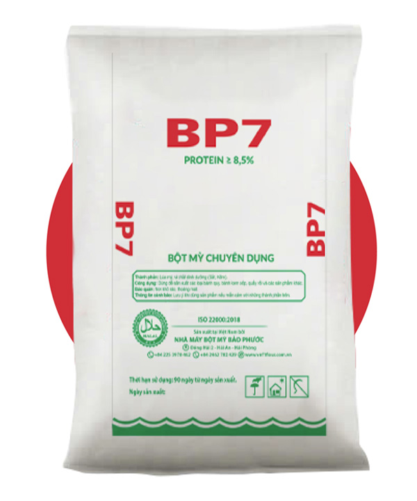 Bột mì chuyên dụng BP7 được sản xuất từ nguyên liệu lúa mì mềm… phù hợp để làm các sản phẩm bánh quy, bánh kem xốp, quẩy và một số sản phẩm làng nghề.