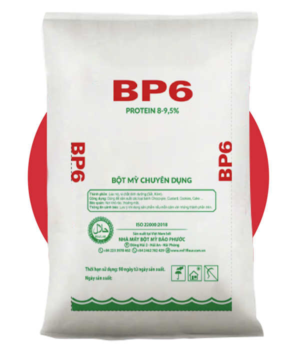 Bột mì chuyên dụng BP6 được sản xuất từ nguyên liệu lúa mì mềm, phù hợp để làm các sản phẩm bánh bông lan (cake), bánh quy (cookies), Custard…